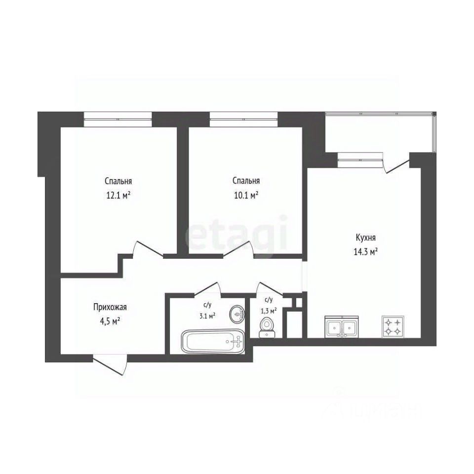 Двухкомнатная квартира площадью 49 м² расположена в современном жилом комплексе бизнес-класса.