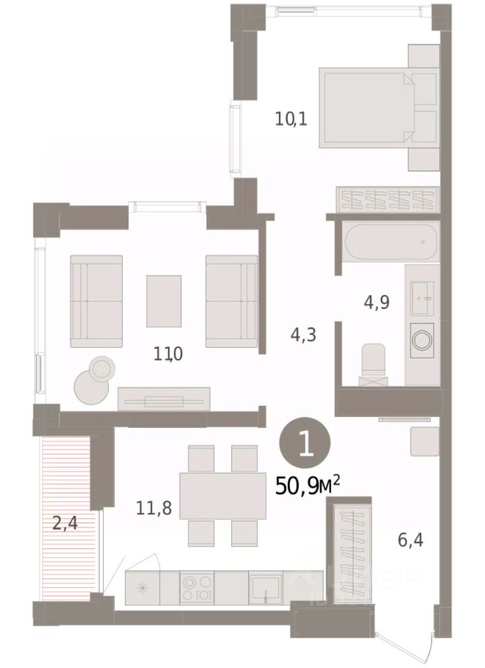 Квартира с кухней-гостиной и одной спальней в жилом районе "Зарека". Особенности планировки: предчистовая отделка.