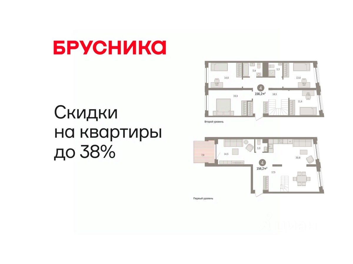 Двухуровневая квартира с кухней-гостиной и четырьмя спальнями в жилом районе "Речной порт". Особенности планировки: вид во двор, второй свет, двухуровневая, свободная планировка, терраса на крыше.