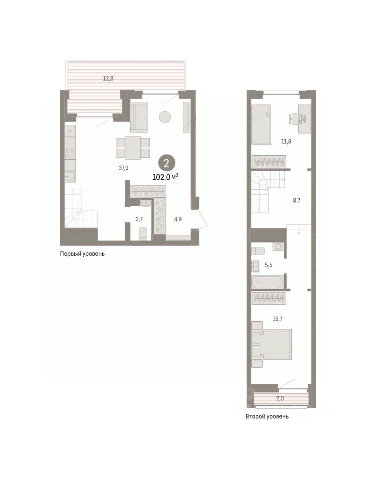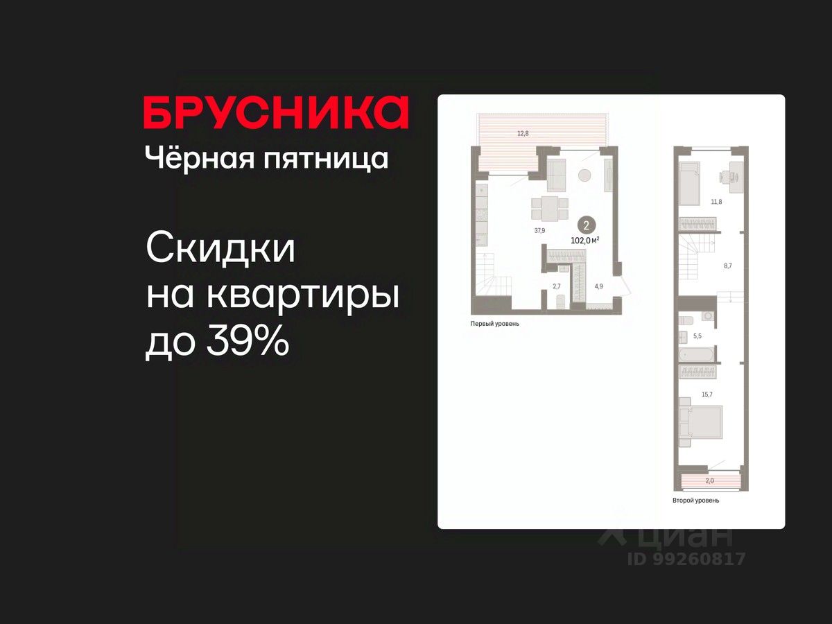 Двухуровневая квартира с кухней-гостиной и двумя спальнями в жилом районе "Речной порт". Особенности планировки: без отделки, двухуровневая, вид во двор, свободная планировка, лоджия, терраса на крыше.