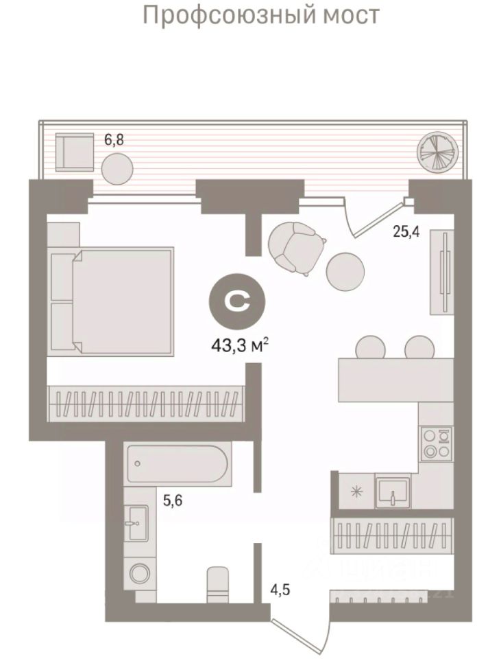 Квартира с кухней-гостиной и одной спальней в жилом районе "Речной порт". Особенности планировки: гардеробная, окна в пол, предчистовая отделка, терраса.