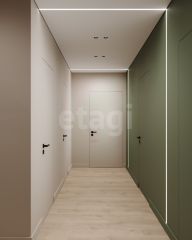 В гостиной и кухне использован топовый цвет 2025 года,Встроенная LED-подсветка мягко подсвечивает интерьер, подчеркивая его глубину и элегантность. Кварцвиниловое покрытие дает тепло и обеспечивает долговечность вашему полу.