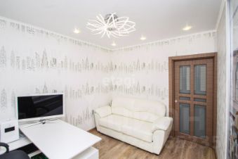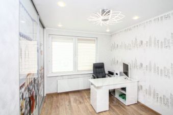 Одна из комнат является кабинетом, в которой расположен удобный шкаф-купе и белоснежный угловой письменный стол.