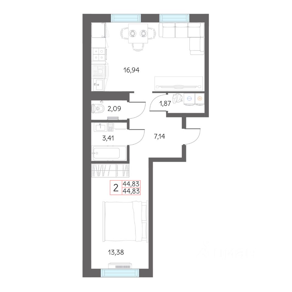 Продаётся 1-комнатная квартира в строящемся доме (ГП-1 (Дом 29)), срок сдачи: I-кв. 2027, общей площадью 44.83 кв.м., на 2 этаже. Рассвет в Тобольске - это жилой комплекс из 4 домов, расположенный в границах улиц Нефтехимиков и Александра Абдулова, созданный для семейного проживания.
