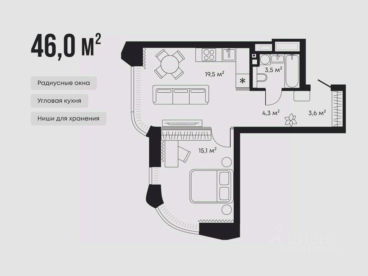 Планировка предусматривает спальню и кухню-гостиную с угловым гарнитуром.