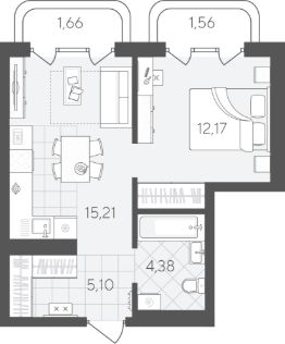 В квартире есть кухня-гостиная и отдельная спальня, предусмотрены ниши под шкафы-купе. Это позволяет оставить больше пространства для жизни.