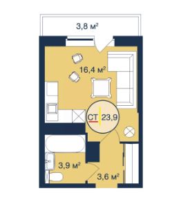 Продаётся 1-комнатная квартира в сданном доме (ГП-1), срок сдачи: I-кв. 2023, общей площадью 23.9 кв.м., на 12 этаже.
