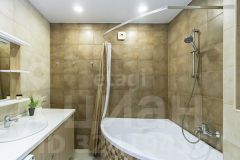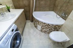 Санузел совмещенный, с большой ванной для релакса и встроенной стиральной машиной всё для удобства, экономии места и нервов.