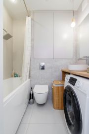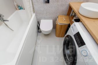 Санузел совмещенный с теплым полом. Стены и пол покрыты керамогранитом. Имеются большое зеркало, встроенный шкаф и большая столешница с раковиной. Установлены ванна и подвесной унитаз с инсталляцией grоhе.