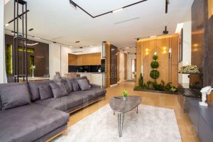 Панорамное остекление, просторная лоджия, фитостена с живыми растениями, автоматический полив, архитектурное стекло с напылением из серебра - все это создает уникальную атмосферу уюта и роскоши.