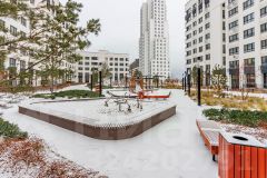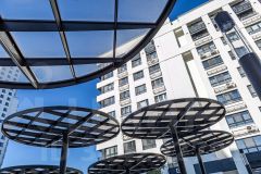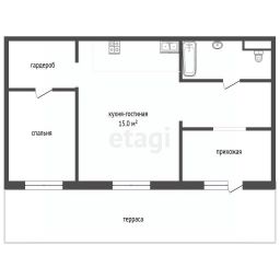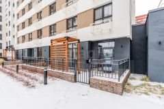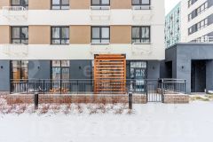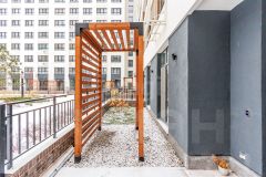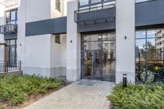 Чтобы попасть в квартиру, необходимо пройти через свою террасу и войти в стеклянную входную группу, избегая встречи с соседями. Вход в квартиру хоть и состоит из стекла, для автономности жизни украшен темными шторами блэкаут. При входе организована прихожая, далее мы попадаем в коридорное пространство, соединенное по европейски с кухней-гостиной. В этом месте можно установить плательный шкаф. Кухня-гостиная находится в помещении слева, далее идет вход в спальню и гардеробную. Во всех комнатах окна в пол и намного выше стандартных, так как потолки начинаются через 3 метра 20 сантиметров от пола. Такое пространство очень легко и удобно декорируется, что доставит радость любой хозяйке.
