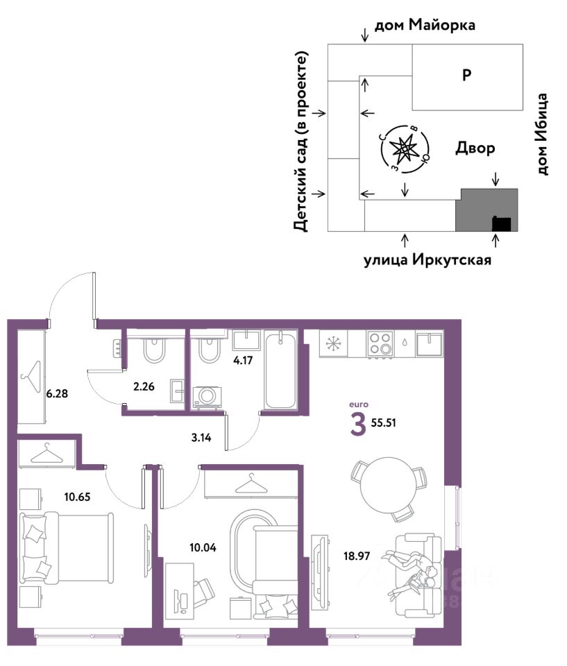 Развитое жилое пространство — закрытые дворы-сады, свои набережная и бульвар, торговая галерея на 1-м этаже, рядом детсады, школы и поликлиника.