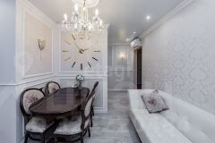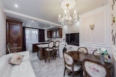 Квартира в отличном состоянии - выполнен основательный ремонт из современных дорогостоящих экологичных строительных материалов: добротные Александрийские двери, качественное напольное покрытие, на стенах обои светлых тонов с молдингами , сан.узлы оформлены плиткой, качественные смесители и сан.фаянс. Проект квартиры выполнен в стиле мягкой городской классики с легким французским акцентом, что придает ей особое очарование. Пространство наполнено светом и воздухом, а использование натуральных материалов, мягких обивок и хрустальных люстр создает гармоничную атмосферу, где каждый элемент находит свое место.