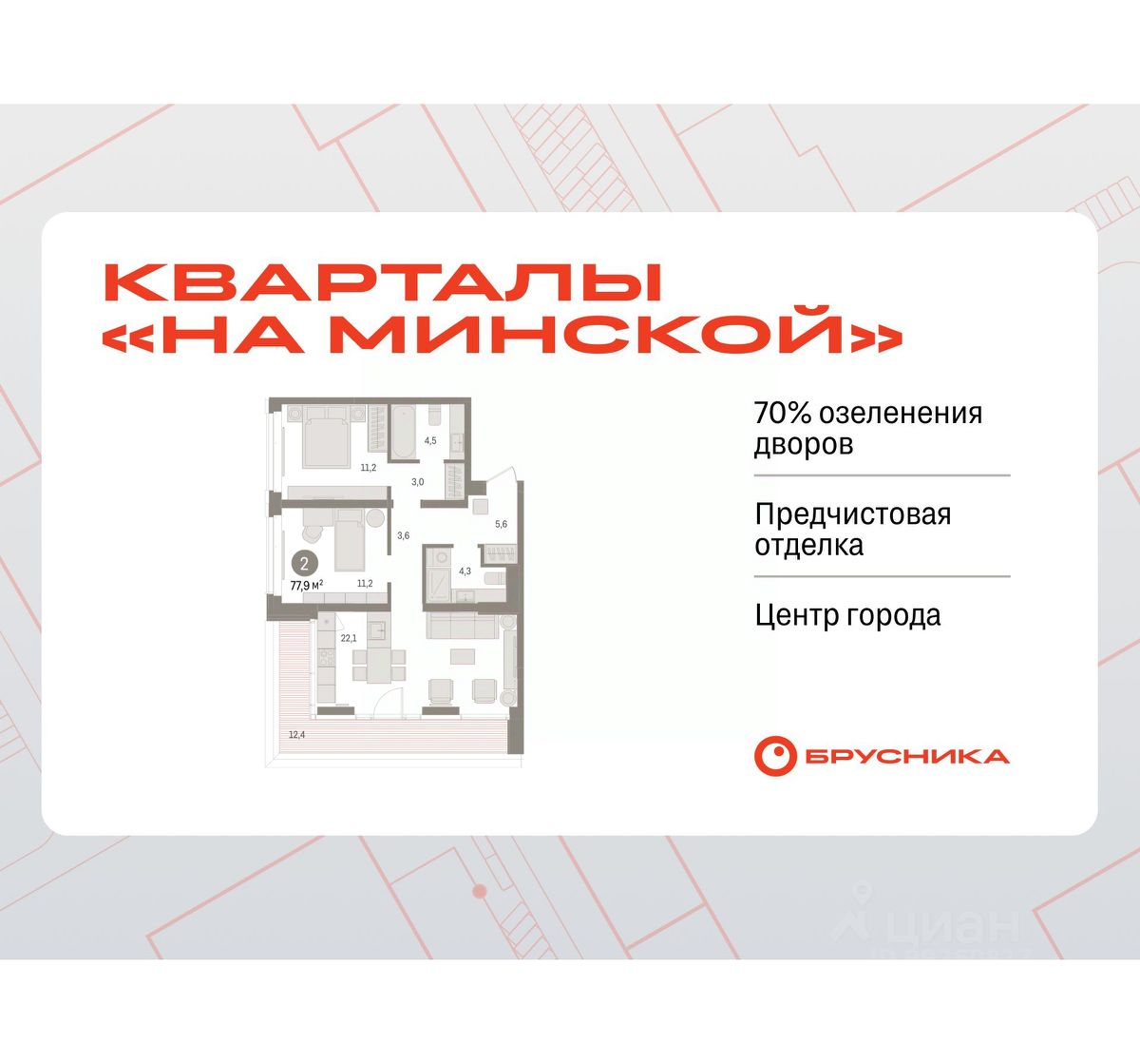 Двухкомнатная квартира от застройщика с предчистовой отделкой в Кварталы "На Минской" на 13 этаже. Общая площадь: 77.85 кв.м., жилая: 22.4 кв.м., площадь просторной кухни-гостиной: 22.1 кв.м. Квартира угловая, окна oбecпeчивaют paвнoмepнoe ocвeщeниe в тeчeниe дня. В квартире один балкон, два совмещенных санузла. Наличие в квартире террасы дает возможность для обустройства дополнительной площади. Высота потолков 2.7 м.