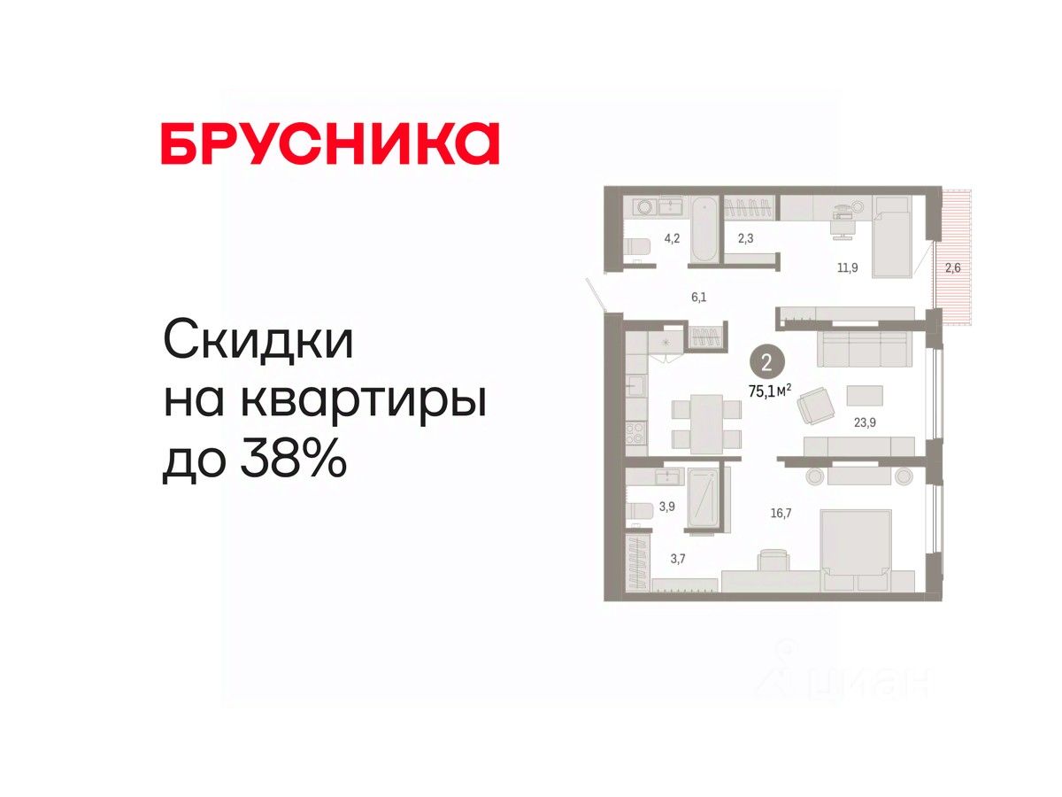 Квартира с кухней-гостиной и двумя спальнями в Октябрьском на Туре. Особенности планировки: балкон, предчистовая отделка, разнесённые спальни.