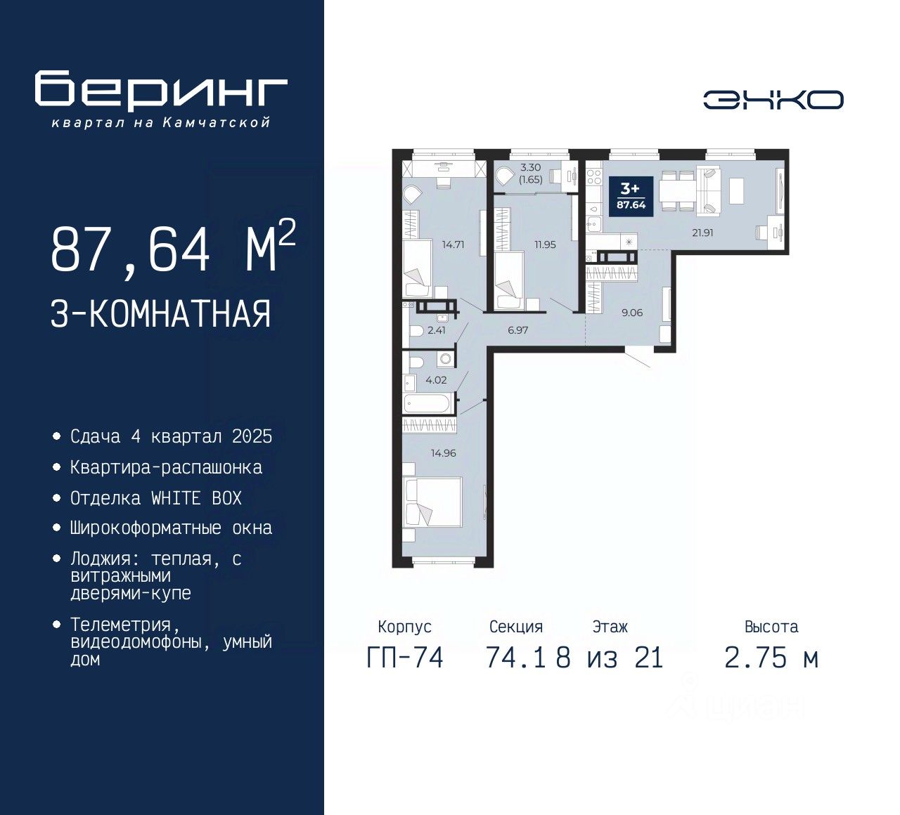 Трехкомнатная квартира в ЖК "Беринг" на 8 этаже. Квартира без отделки, полностью готова к чистовой отделке и дальнейшему ремонту. Общая площадь: 87.64 кв.м., жилая: 41.62 кв.м., площадь просторной кухни-столовой: 21.91 кв.м. Квартира - распашонка, без проходных комнат, окна выходят на paзные стороны дома. В квартире одна лоджия, один совмещенный и один раздельный санузел. Высота потолков 2.75 м.