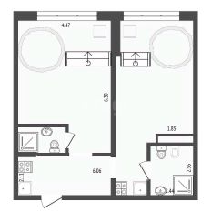 две просторные жилые изолированные комнаты, каждая со своим совмещенным санузлом и кухней.