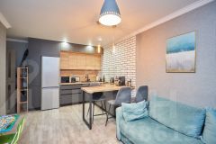 Кухонный гарнитур выполнен на заказ и оснащен качественной фурнитурой. В подарок новым владельцам остаются современный холодильник и индукционная варочная поверхность. По всей квартире уложен ламинат, а в коридоре керамогранит с подогревом, что создаст комфорт в любое время года. Стены в комнатах оформлены стильными обоями, а потолки украшены натяжными конструкциями, что придает квартире современный вид.