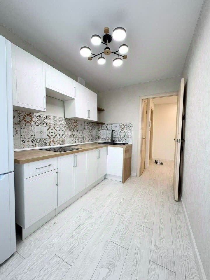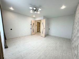 В квартире выполнен новый качественный ремонт. Везде установлены новые пластиковые окна, межкомнатные двери. На полу ламинат 32 класса. Обои на стенах современные в светлых тонах. Натяжные матовые потолки с красивыми люстрами. В санузлах современная плитка под бетон, новая сантехника.