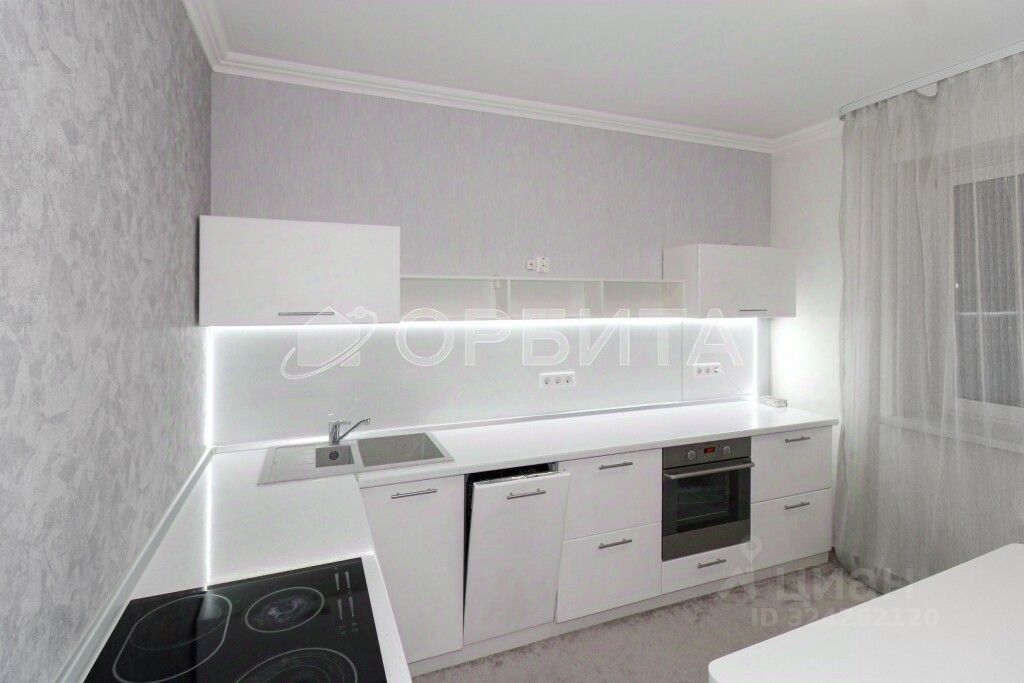 Установлен белый кухонный гарнитур с брендовой бытовой техникой.