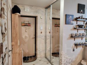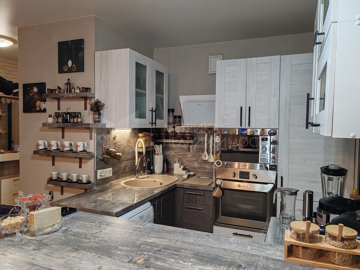Кухня-гостиная с кухонным гарнитуром и встроенной техникой, зеркальный шкаф-купе в коридоре.