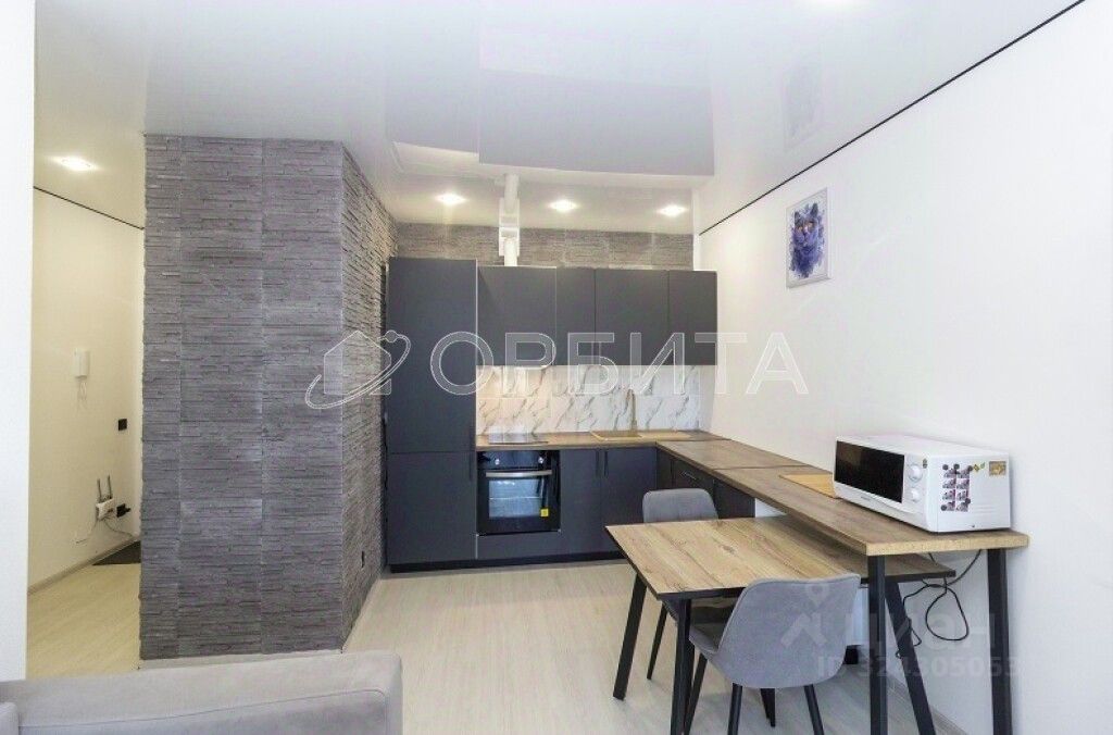 • Обставлена современной мебелью и техникой: кухонный гарнитур с бытовой техникой (холодильник, варочная панель, духовой шкаф, вытяжка, посудомоечная машина), обеденная зона, диван, телевизор, двуспальная кровать, кондиционер, шкаф и система хранения.
