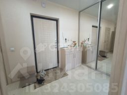 Санузел весь выложен плиткой, тумба с раковиной и зеркалом, душевая кабина и стиральная машинка. На кухне остается варочная панель и холодильник. Так же в квартире есть теплый пол. Встроенный шкаф с большими зеркалами.
