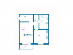 Общая площадь - 46,5 кв.м. Просторная комната - 17, 89 кв.м., кухня - 11, 97 кв.м. Большой сан. узел - 6,61 кв.м.