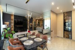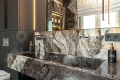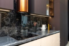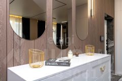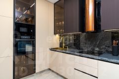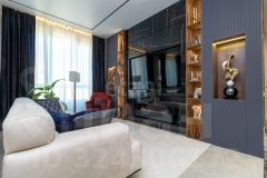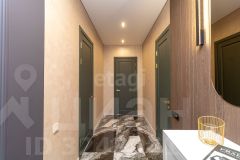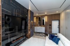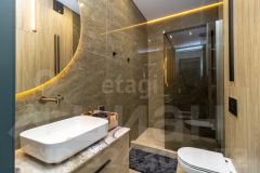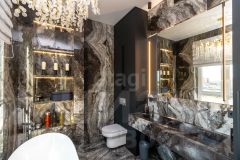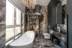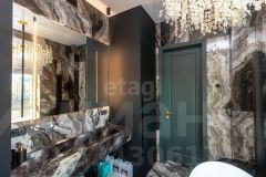 На полу вас встретит роскошный широкоформатный керамогранит, а стены оформлены венецианской штукатуркой, что придаёт помещению элегантный вид. Высокие потолки (3 м) и двери (2,3 м) визуально увеличивают пространство, а натяжные потолки с точечным освещением создают особую атмосферу. Тёплый электрический пол обеспечит комфорт в любое время года, а мебель, изготовленная на заказ, гарантирует долговечность и удобство.