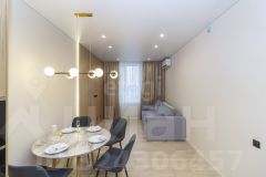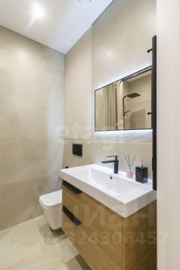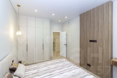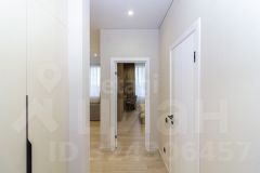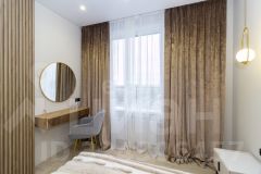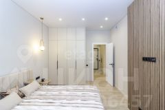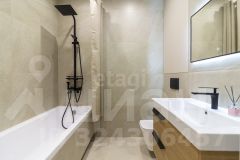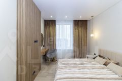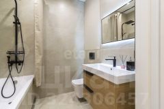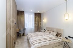 Спальня оборудована туалетным столиком и шторами из турецкого бархата, добавляющими интерьеру элегантность. В ванной комнате использован крупноформатный керамогранит, установлена просторная ванна, гигиенический душ Am.PM, теплый пол и раковина из высококачественной керамики. Вентиляционная решетка интегрирована в потолок, а двери с эмалевым покрытием и рельефными ручками Morelli дополняют стильный дизайн.