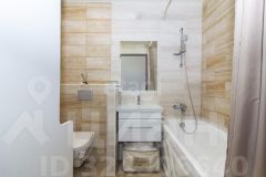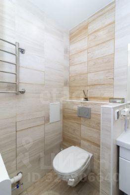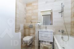 - Санузел: Современный дизайн туалета с инсталляцией унитаза, стены ванной комнаты облицованы плиткой