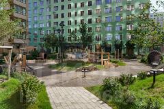 Изолированный двор с интерактивной площадкой для отдыха и развлечений. Много зеленых насаждений, прогулочный бульвар. Игровая зона.