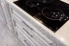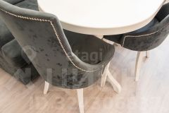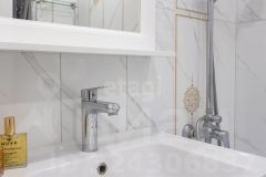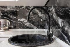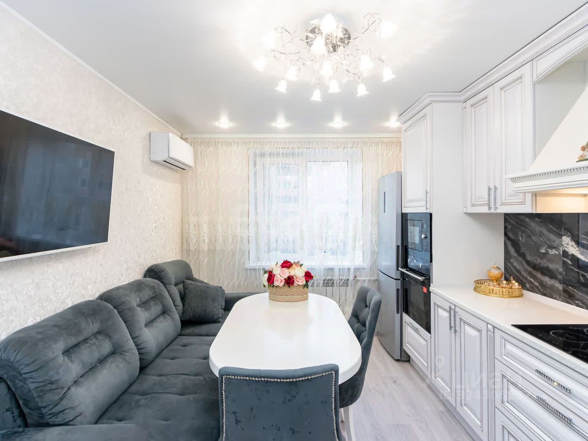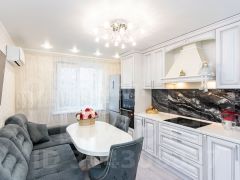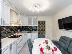 Кухня — это настоящая жемчужина квартиры! Здесь установлен современный кухонный гарнитур с встроенной бытовой техникой высшего класса, а фартук из керамогранита добавляет изысканности. Просторная кухня позволяет выделить уютную зону отдыха с диваном, выполненным на заказ, и стильными стульями, обтянутыми в тон дивану. Это идеальное место для семейных ужинов и встреч с друзьями.