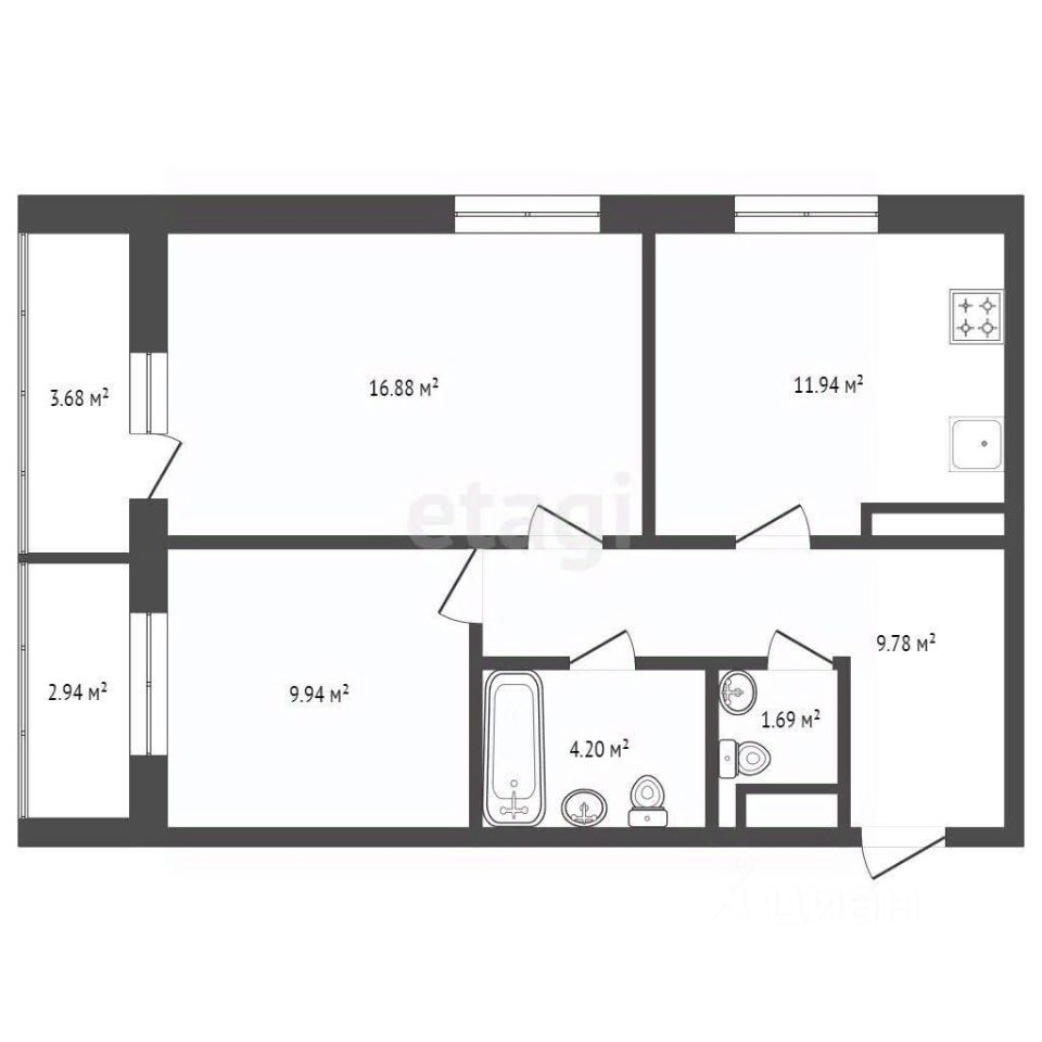 Планировка: просторная кухня, 2 изолированные спальные комнаты, санузел - совмещенный, небольшая вместительная кладовка, а также балкон и открытая лоджия. На планировке представлен гостевой туалет, переоборудованный в кладовку.