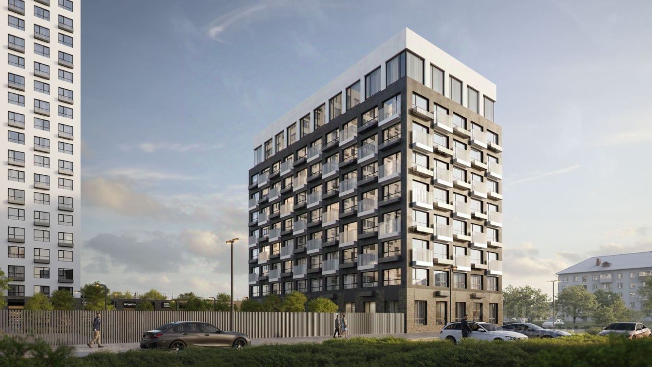19-этажная архитектурная доминанта с эффектом паруса и камерная секция: французские балконы, сити-хаусы на 1-м этаже, 9 этажей в доме. Уступчатая структура формирует динамичный силуэт — новый акцент ул. Полевая. Металлические балконы создают градиент от тёмного к светлому, большие окна — панорамные виды на город.
