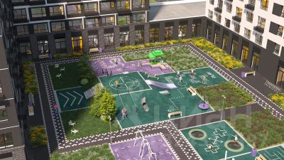 19-этажная архитектурная доминанта с эффектом паруса и камерная секция: французские балконы, сити-хаусы на 1-м этаже, 9 этажей в доме. Уступчатая структура формирует динамичный силуэт — новый акцент ул. Полевая. Металлические балконы создают градиент от тёмного к светлому, большие окна — панорамные виды на город.