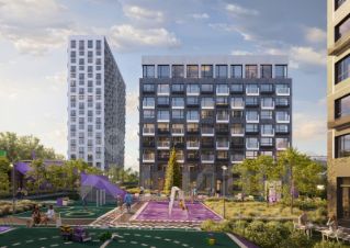 19-этажная архитектурная доминанта с эффектом паруса и камерная секция: французские балконы, сити-хаусы на 1-м этаже, 9 этажей в доме. Уступчатая структура формирует динамичный силуэт — новый акцент ул. Полевая. Металлические балконы создают градиент от тёмного к светлому, большие окна — панорамные виды на город.