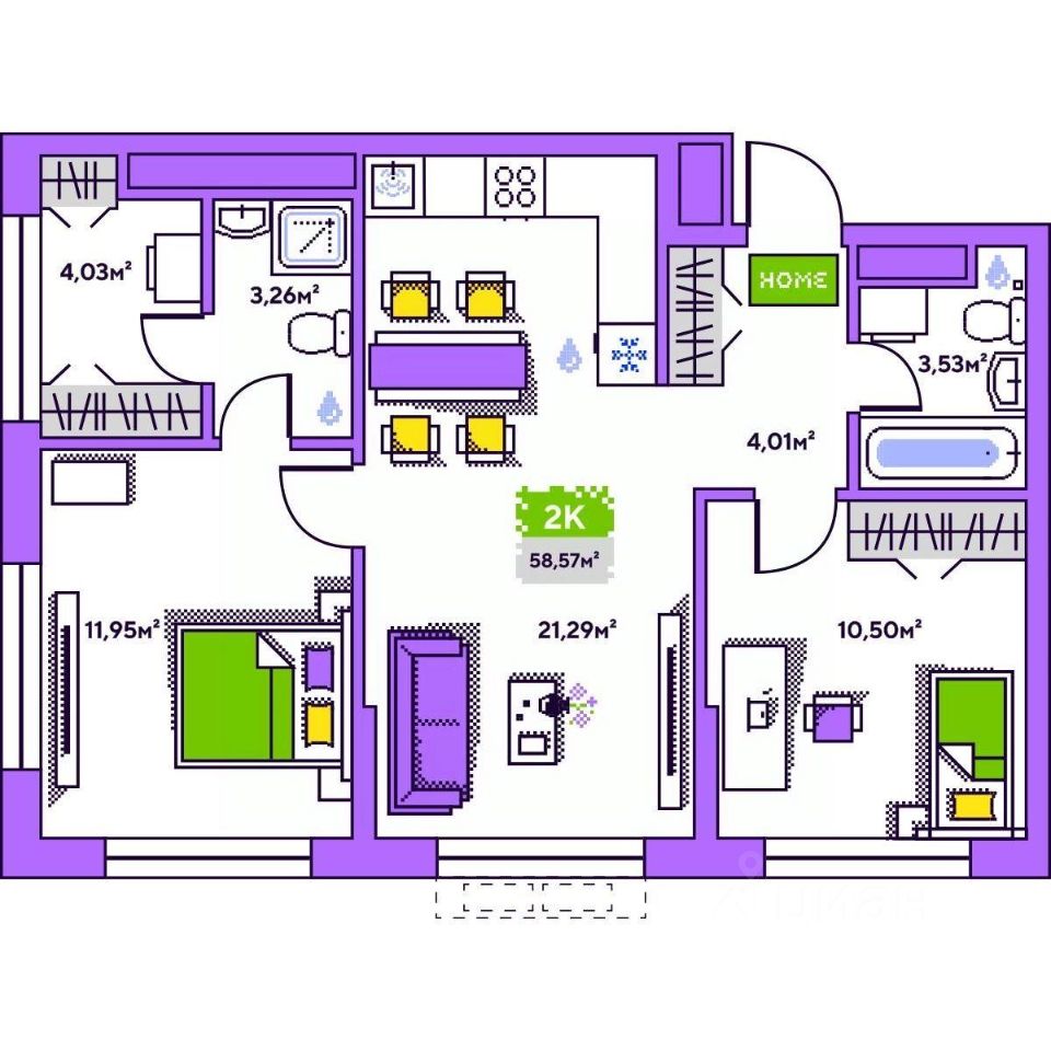 Общая площадь58,57 м²