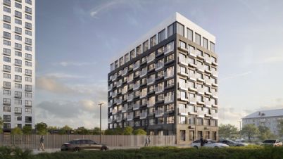 19-этажная архитектурная доминанта с эффектом паруса и камерная секция: французские балконы, сити-хаусы на 1-м этаже, 9 этажей в доме. Уступчатая структура формирует динамичный силуэт — новый акцент ул. Полевая. Металлические балконы создают градиент от тёмного к светлому, большие окна — панорамные виды на город.