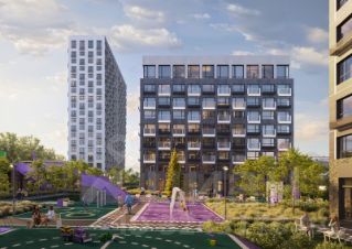 19-этажная архитектурная доминанта с эффектом паруса и камерная секция: французские балконы, сити-хаусы на 1-м этаже, 9 этажей в доме. Уступчатая структура формирует динамичный силуэт — новый акцент ул. Полевая. Металлические балконы создают градиент от тёмного к светлому, большие окна — панорамные виды на город.