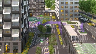 19-этажная архитектурная доминанта с эффектом паруса и камерная секция: французские балконы, сити-хаусы на 1-м этаже, 9 этажей в доме. Уступчатая структура формирует динамичный силуэт — новый акцент ул. Полевая. Металлические балконы создают градиент от тёмного к светлому, большие окна — панорамные виды на город.