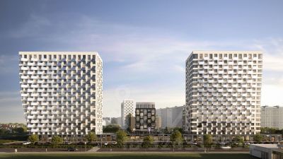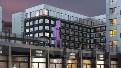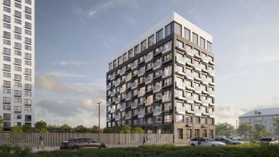19-этажная архитектурная доминанта с эффектом паруса и камерная секция: французские балконы, сити-хаусы на 1-м этаже, 9 этажей в доме. Уступчатая структура формирует динамичный силуэт — новый акцент ул. Полевая. Металлические балконы создают градиент от тёмного к светлому, большие окна — панорамные виды на город.