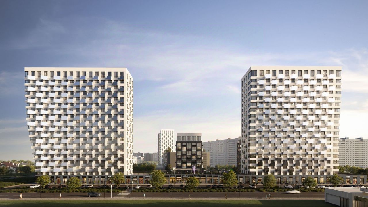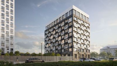 19-этажная архитектурная доминанта с эффектом паруса и камерная секция: французские балконы, сити-хаусы на 1-м этаже, 9 этажей в доме. Уступчатая структура формирует динамичный силуэт — новый акцент ул. Полевая. Металлические балконы создают градиент от тёмного к светлому, большие окна — панорамные виды на город.