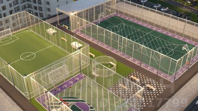 19-этажная архитектурная доминанта с эффектом паруса и камерная секция: французские балконы, сити-хаусы на 1-м этаже, 9 этажей в доме. Уступчатая структура формирует динамичный силуэт — новый акцент ул. Полевая. Металлические балконы создают градиент от тёмного к светлому, большие окна — панорамные виды на город.