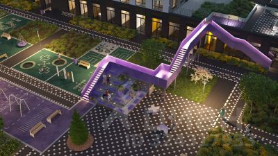 19-этажная архитектурная доминанта с эффектом паруса и камерная секция: французские балконы, сити-хаусы на 1-м этаже, 9 этажей в доме. Уступчатая структура формирует динамичный силуэт — новый акцент ул. Полевая. Металлические балконы создают градиент от тёмного к светлому, большие окна — панорамные виды на город.