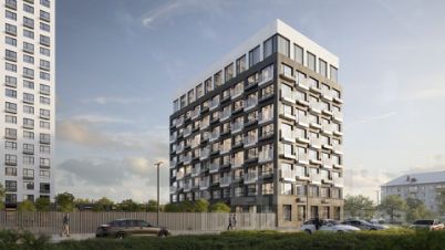 19-этажная архитектурная доминанта с эффектом паруса и камерная секция: французские балконы, сити-хаусы на 1-м этаже, 9 этажей в доме. Уступчатая структура формирует динамичный силуэт — новый акцент ул. Полевая. Металлические балконы создают градиент от тёмного к светлому, большие окна — панорамные виды на город.
