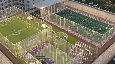19-этажная архитектурная доминанта с эффектом паруса и камерная секция: французские балконы, сити-хаусы на 1-м этаже, 9 этажей в доме. Уступчатая структура формирует динамичный силуэт — новый акцент ул. Полевая. Металлические балконы создают градиент от тёмного к светлому, большие окна — панорамные виды на город.