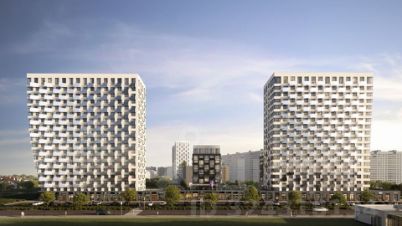 19-этажная архитектурная доминанта с эффектом паруса и камерная секция: французские балконы, сити-хаусы на 1-м этаже, 9 этажей в доме. Уступчатая структура формирует динамичный силуэт — новый акцент ул. Полевая. Металлические балконы создают градиент от тёмного к светлому, большие окна — панорамные виды на город.