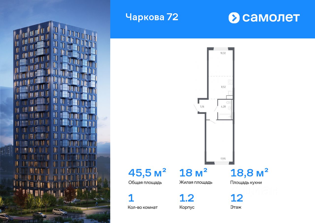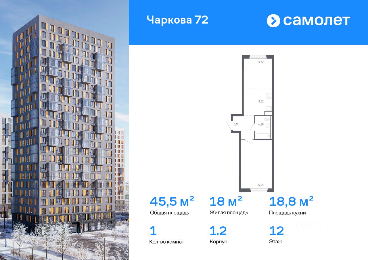 Строим кварталы для жизни с заботой о будущем. Предлагается 1-комнатная квартира комфорт-класса 45,5 кв.м в корпусе 1.2 на 12 этаже, в ЖК "Чаркова 72"