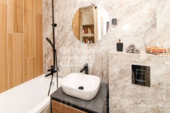 Ванная комната оснащена электрическим теплым полом, подвесной тумбой с накладной раковиной, ванной с душевой системой.